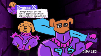 Adorable and one of the silliest games I've ever played XD Kind of makes me think of Stephen (thecatamites)'s early work like Paul Moose or Rip van Bubsy in a very nice way, although obviously it's got its own thing too. I loved how even though you have a big fancy suit of armor and stuff you just run around and bark at things like a regular dog. Excellent gameplay BARK!/BARK!